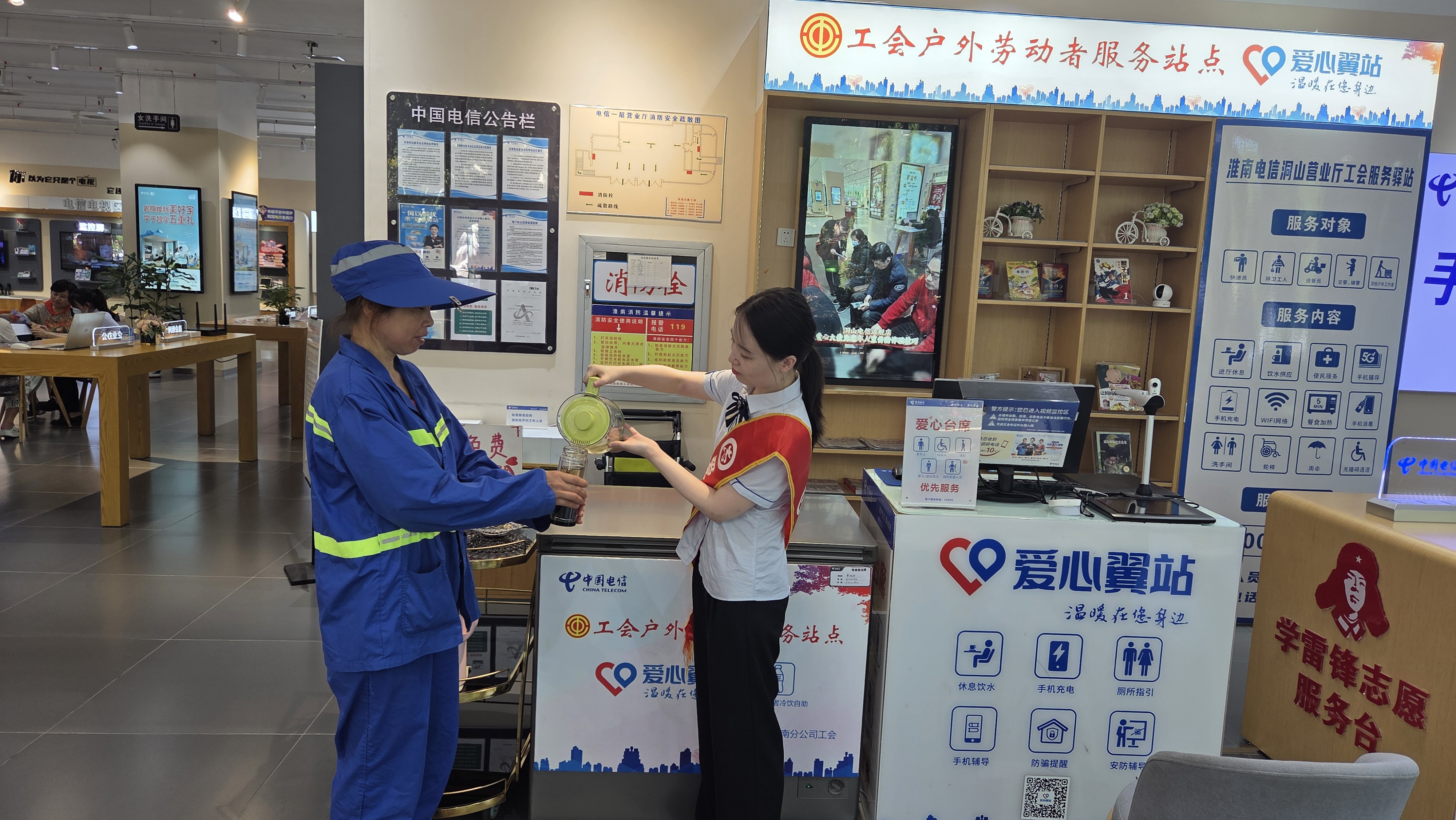 全省各地电信营业厅爱心翼站纷纷设立清凉站点,为户外劳动者打造了温馨港湾。这些站点为过往的户外工作者提供了一系列贴心服务,站内设有消暑休息区域,还提供免费充电服务,解决了他们手机电量不足的困扰;餐食加热服务让他们辛苦工作后能吃上热乎饭;工作人员还耐心为有需要的人提供手机使用辅导。